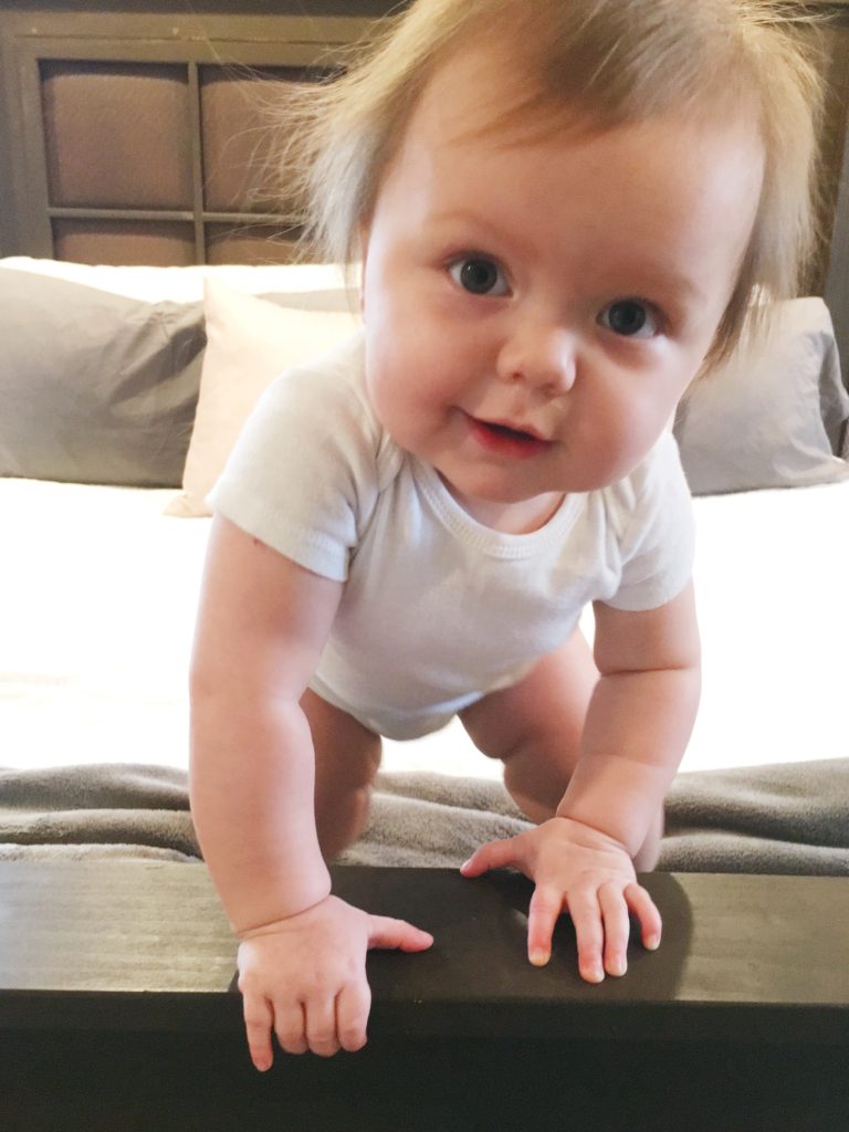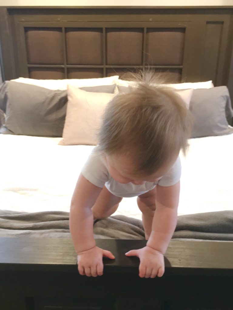– I told the doctor at your nine month appointment that I was a little concerned you weren’t crawling yet. I kid you not, that same evening you decided to crawl like it was no big thing. You heard me, I know you did. But, beyond crawling, you’re now pulling up and climbing on EVERYTHING. You seem to think you can walk, because you just launch yourself out of our arms. You can stand on your own occasionally, but only when you’re distracted.