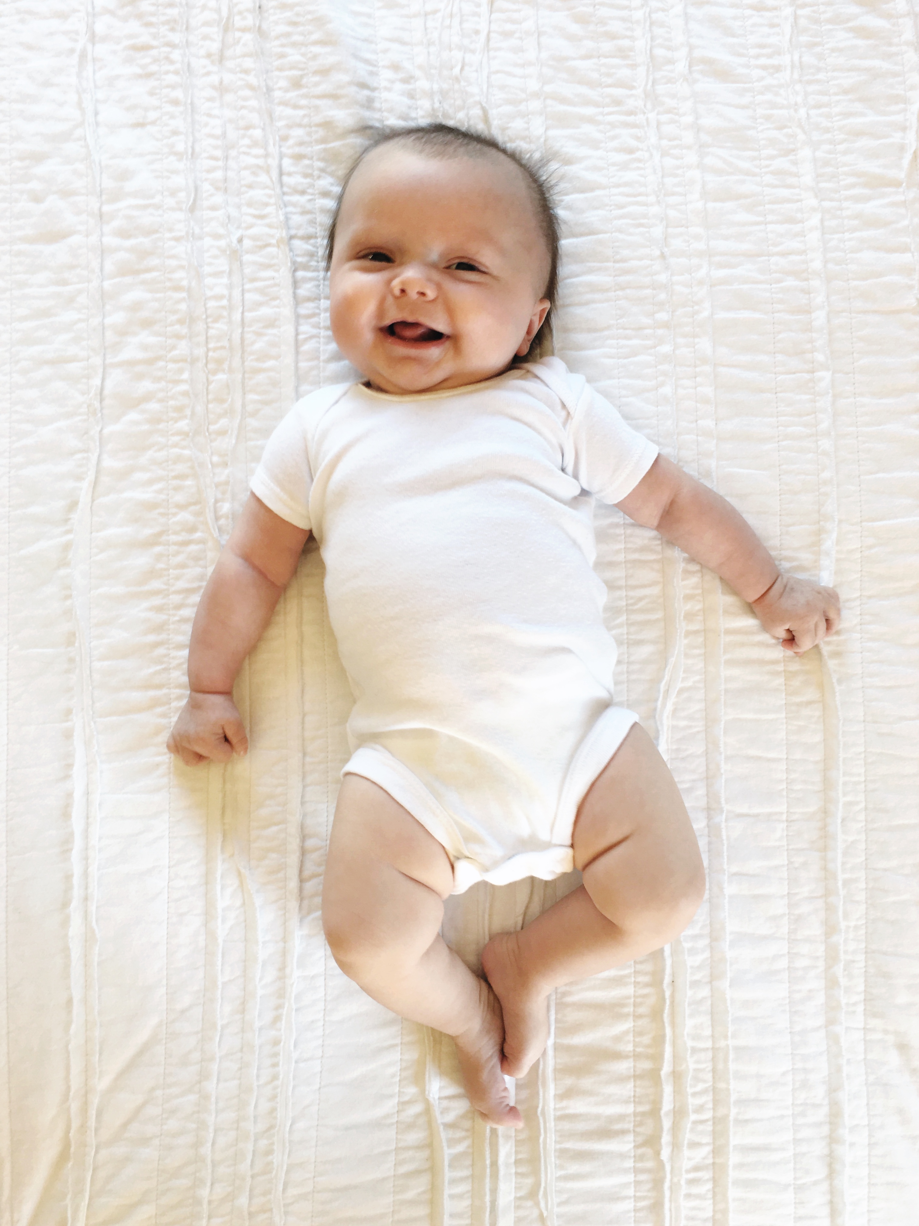 – We swaddle you at night. When you wake up in the morning, and we unwrap you, you always give us the BIGGEST stretch. Arms over your head, feet straight out, and a giant smile on your face. It’s the cutest thing we’ve ever seen.