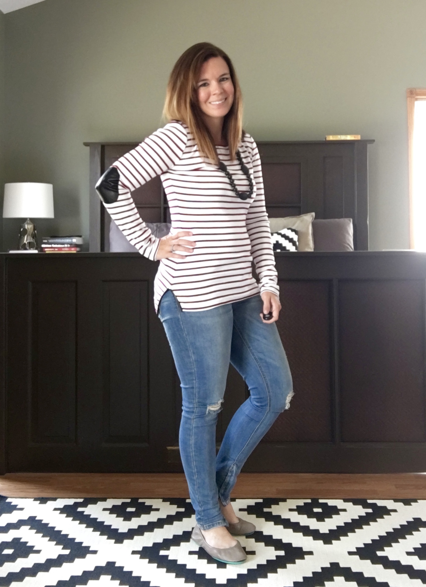 You see, in my stylist note I asked for transitional fall pieces. It will be cold here in the Midwest before we know it, so I wanted to get a jump start on my autumn wardrobe. I specifically mentioned my Pinterest board again, and noted that I would like to see colors like burgundy, mustard, olive, black, etc.