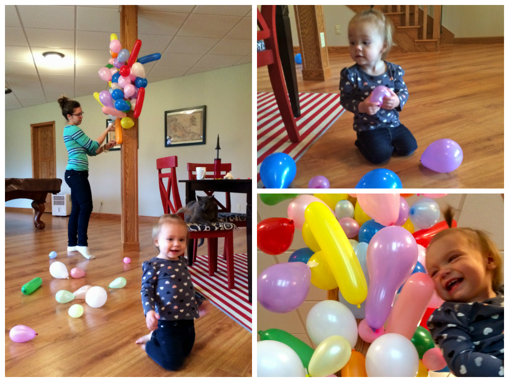 While my one-year old isn’t exactly an art critic, it’s clear she already shares her momma’s appreciation for all things Chihuly. Her animated gasps at Fireworks’ beauty tell me so. 😉 We were inspired to grab a bag of assorted balloons and create our own work of art in our basement. It was a family affair—my husband blew up the balloons (we recommend splurging for a hand pump), I tied, and the toddler giggled as we worked. As we blew up various balloons, we talked about their different physical aspects—the color, size and shapes—and then taped them into a sculpture form.