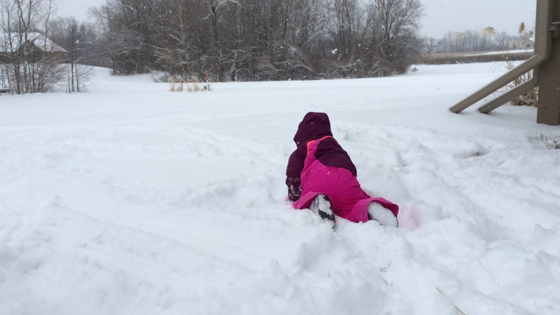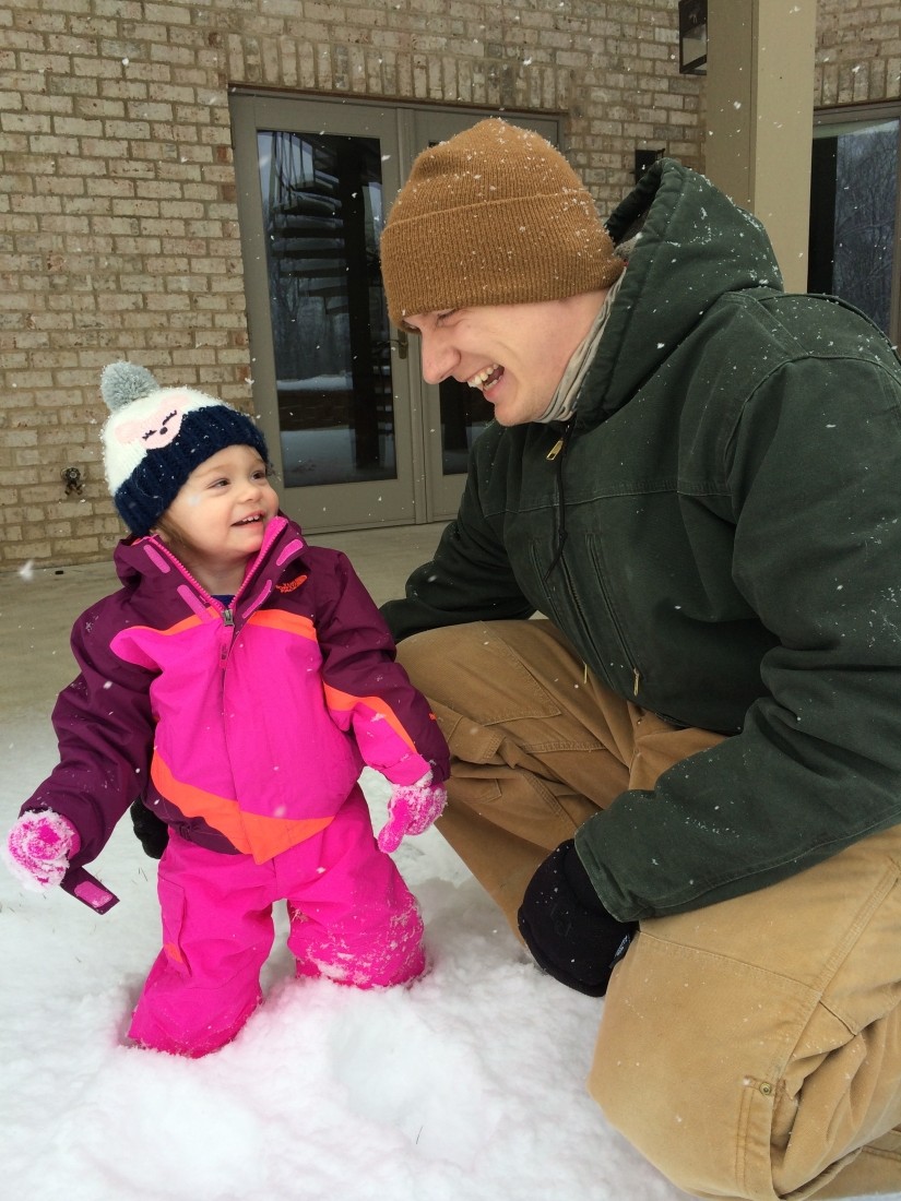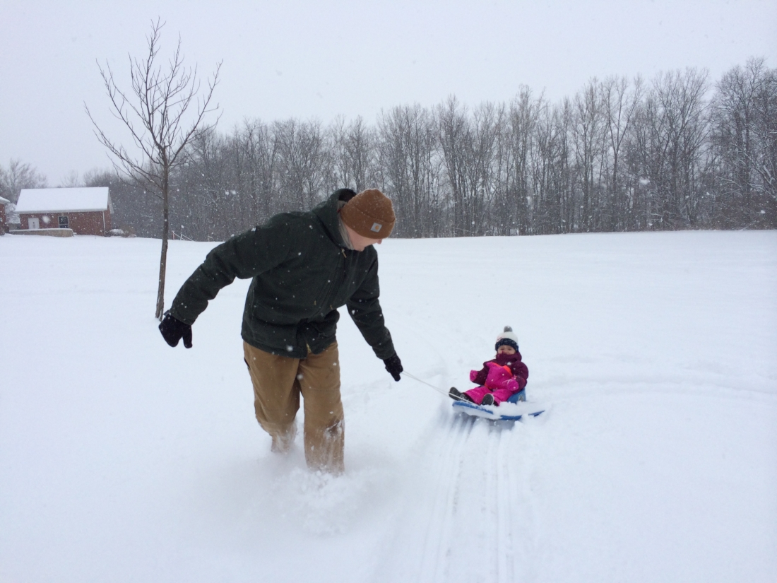 But, today was the day. Today we had no plans, and a fresh five inches of snow. Today we bundled up to play outside as a family, like a bunch of kids. We got out Dorothy’s new sled (she’s not spoiled at all…), and took turns pulling her around the yard – much to her delight. We made snow angels, and threw snowballs, and laughed at Dorothy’s determination to army crawl through the flurries.
