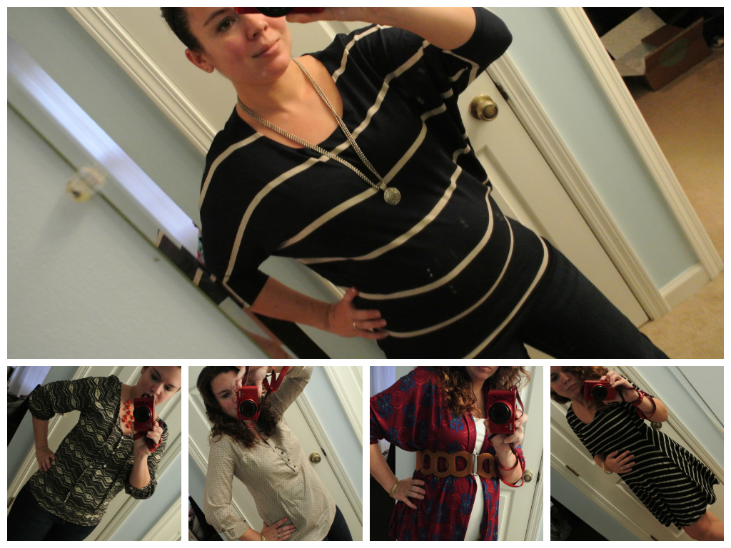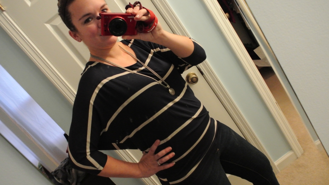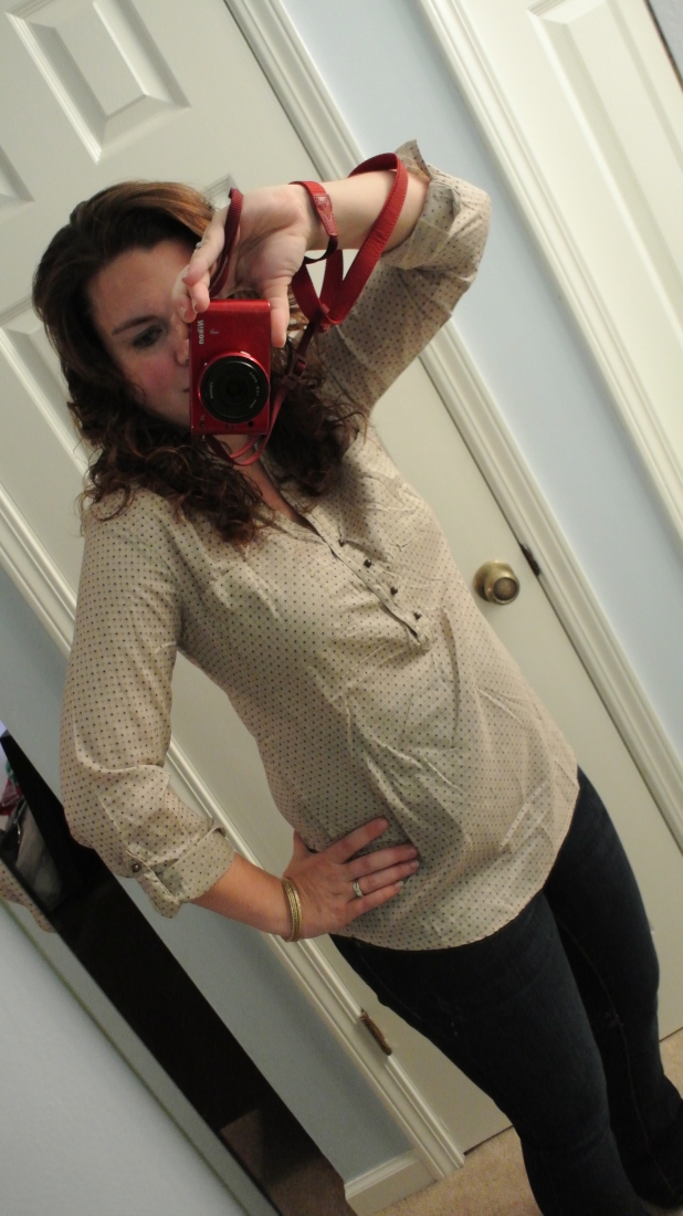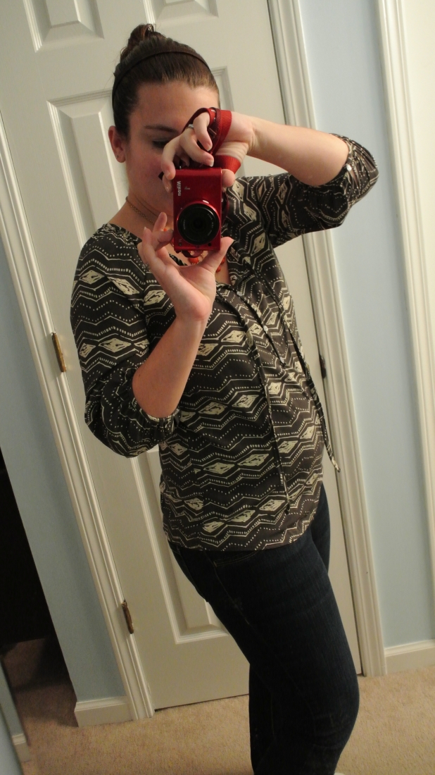 I loved the tribal pattern and the olive color of this shirt. It was a little tight, but I attribute this to the 8 pounder that was cut out of me 10 days earlier. We’ll get there. Anyway – I definitely kept this top. 🙂