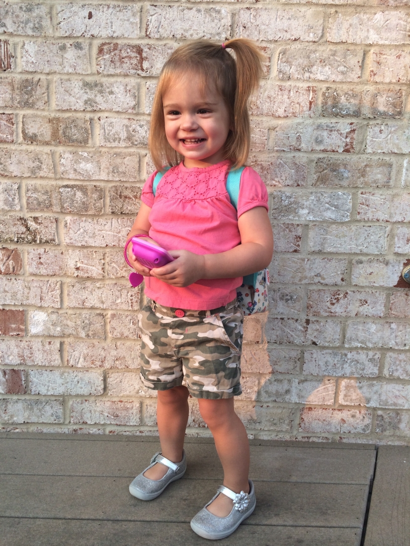 Dorothy’s first day of school, 2015. Age 1. Backpack on, cell phone ready.