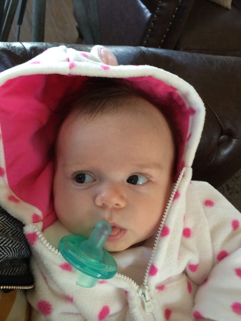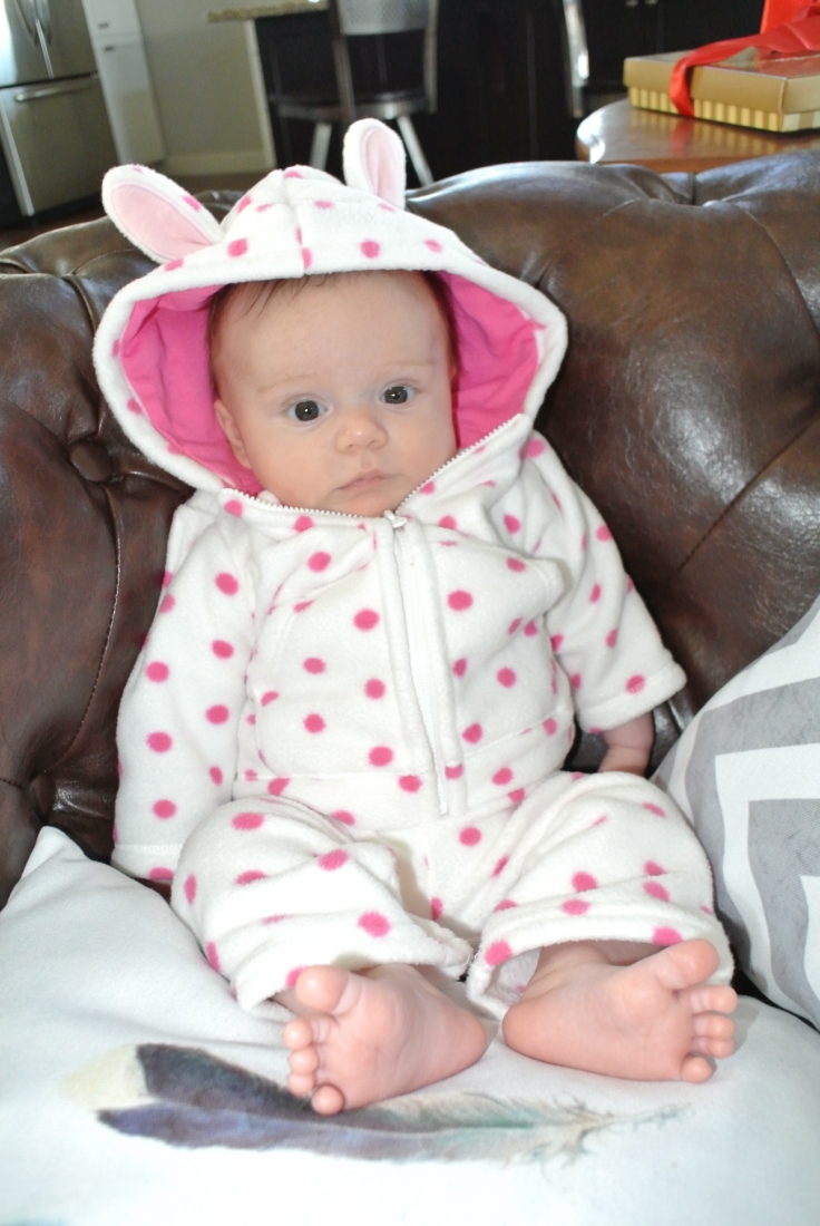 I happened to dress my daughter in this sweatsuit when she was two months old (given to us by the bestie, so this could potentially be all her fault). I’m guessing it’s meant to be a snow bunny, since we were nowhere near Easter. It features bunny ears, and even a little cotton tail on the butt.