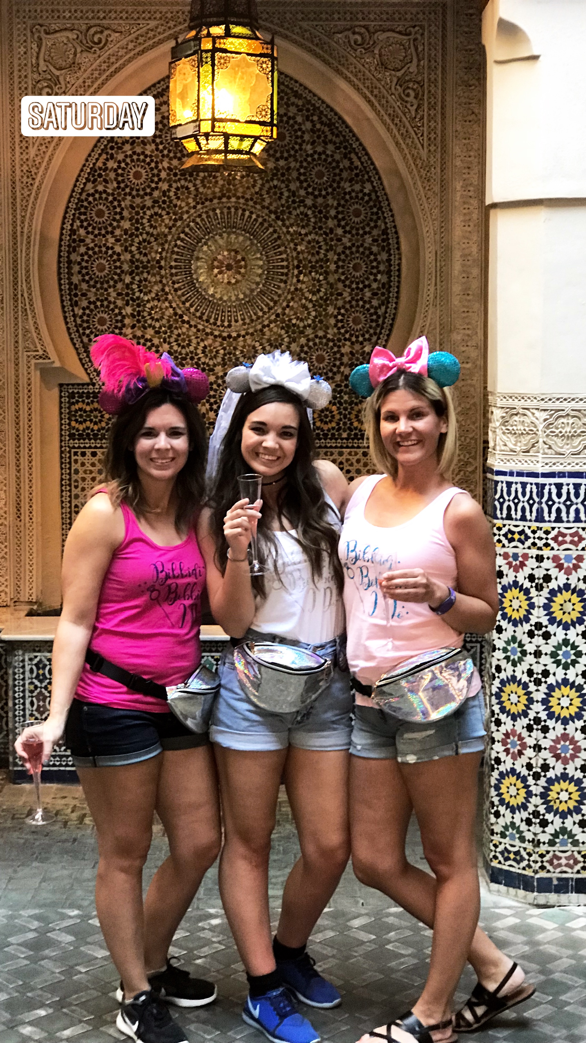 Grace and I invited our cousin, Kayla, to go with us (she’s the life of the party, and a solid buffer for three sisters), and of course she was in on the surprise. Together, we spent MONTHS planning. Literal MONTHS. Everything from the restaurant reservations, to the coordinating shirts, to the holographic bum bags, to the themed Minnie Mouse ears – we literally made sure every detail was as perfect as could be without ever saying a word to the bride.
